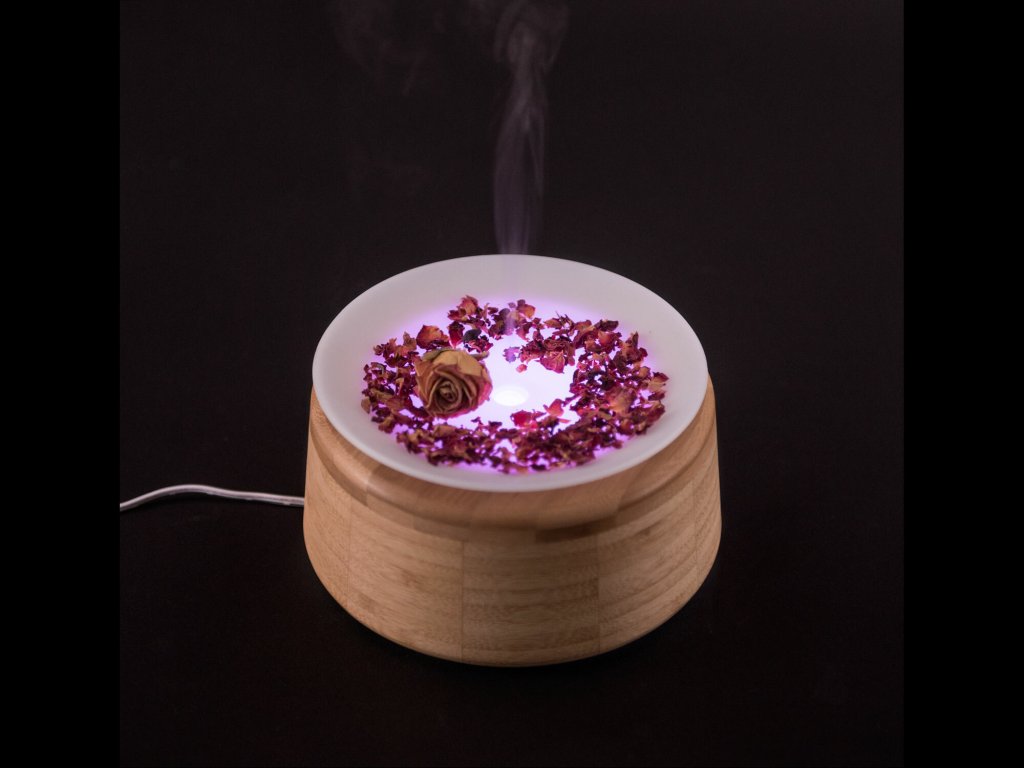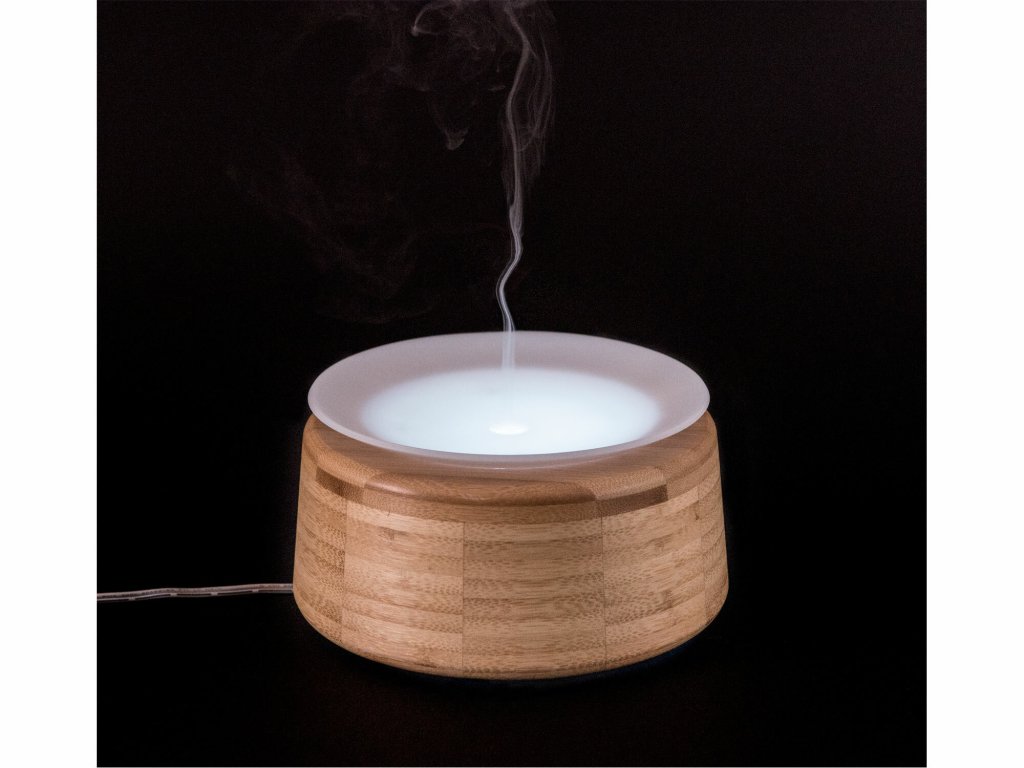 Zvlhčovač vzduchu s difuzérom vyrobený z prírodného bambusového dreva. Aromatizuje a zvlhčuje vzduch kombináciou účinkov vodnej hmly a esenciálnych olejov. Pomocou jemného ultrasonického vlnenia rozkladá esenciálne oleje na extrémne malé mikročastice, bez toho aby ich zahrieval. Oleje si tak zachovávajú pôvodnú vôňu aj liečivé účinky. Aróma difuzér vám pomôže vytvoriť z každej izby voňajúce oázu a navodiť relaxačnú atmosféru. Bez pridania esenciálneho oleja vám aróma difuzér poslúži ako zvlhčovač vzduchu. Pridaním konkrétneho esenciálneho oleja môžete sebe, alebo vašim blízkym pomôcť s rôznymi ťažkosťami. Postačí pár kvapiek kvalitného oleja a môžete uľaviť nádche, kašľu, bolestiam hlavy, alebo zlému zaspávanie. Správne zvolený olej vyčistí vzduch, alebo vám jednoducho spríjemní pobyt v miestnosti, v ktorej sa práve nachádzate. Vďaka neutrálnemu dizajnu z bambusového dreva štýlovo doplní vybavenie všetkých obytných priestorov, detských izieb, rokovacích miestností, masážnych salónov, wellness centier apod. Do hornej misky difuzéra môže položiť kvety, okvetné lístky alebo okrasné kamene. Vhodne zvolenými esenciálnymi olejmi môžete podporiť relaxačnú atmosféru v spálni, dezinfekciu vzduchu či pokojný spánok v detskej izbe. Koncentráciu v izbe študenta alebo uvoľnenú komunikáciu, či už doma alebo v pracovnom prostredí. Používajte vždy kvalitné oleje. Použitím lacných, umelých olejov síce vytvoríte voňavé prostredie, ale telo a myseľ si neodpočinú. Citlivým osobám môže naopak uškodiť. Napríklad bolestí hlavy a pod. Počas prevádzky aróma difuzéra možno ľubovoľne a jednoducho nastaviť svetelné efekty, ktoré vytvoria vo vašej izbe veľmi príjemné prostredie a navodí relaxačnú atmosféru. Aróma difuzér je vhodný všade, kde je z bezpečnostných dôvodov nemožné použiť otvorený oheň (sviečky v aróma lampách). Kombinuje účinky vodnej hmly a esenciálnych olejov. Obsluha aróma difuzéra je veľmi jednoduchá. Do zásobníka nalejete vodu, najlepšie destilovanú. Nakvapkať niekoľko kvapiek esenciálneho oleja a prístroj zapnete stlačením tlačidla. Aróma difuzér začne okamžite vytvárať vodnú hmlu a rozptyľovať olej do vzduchu. Ďalšími stlačeniami môžete nastaviť rôzne farby v intenzívnejšie alebo svetlejšie verziu, ktoré zostanú nastavené počas prevádzky prístroja, kým ich nezmeníte. Nemusíte kontrolovať množstvo vody v zásobníku. Po vyprázdnení sa aróma difuzér sám vypne.- automatické vypnutie pri vyprázdnení nádobky na vodu