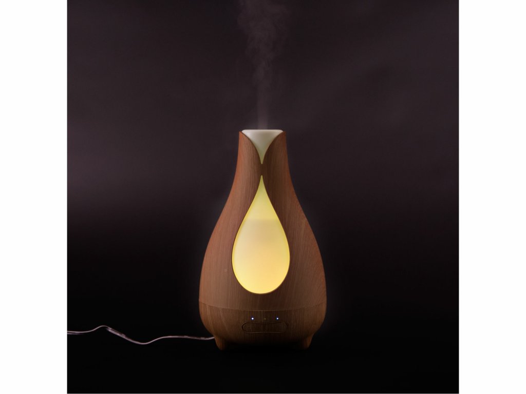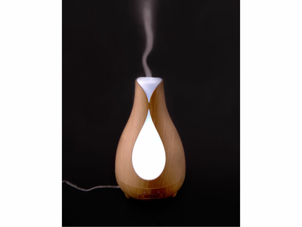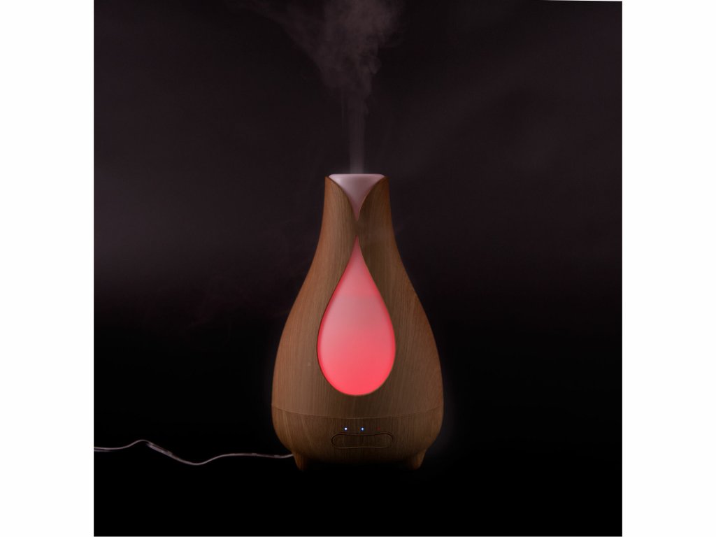 Zvlhčovač vzduchu s difuzérom v dizajne prírodného dreva (imitácia dreva). Aromatizuje a zvlhčuje vzduch kombináciou účinkov vodnej hmly a esenciálnych olejov. Pomocou jemného ultrasonického vlnenia rozkladá esenciálne oleje na extrémne malé mikročastice, bez toho aby ich zahrieval. Oleje si tak zachovávajú pôvodnú vôňu aj liečivé účinky. Aróma difuzér vám pomôže vytvoriť z každej izby voňajúce oázu a navodiť relaxačnú atmosféru. Bez pridania esenciálneho oleja vám aróma difuzér poslúži ako zvlhčovač vzduchu. Pridaním konkrétneho esenciálneho oleja môžete sebe, alebo vašim blízkym pomôcť s rôznymi ťažkosťami. Postačí pár kvapiek kvalitného oleja a môžete uľaviť nádche, kašľu, bolestiam hlavy, alebo zlému zaspávanie. Správne zvolený olej vyčistí vzduch, alebo vám jednoducho spríjemní pobyt v miestnosti, v ktorej sa práve nachádzate. Vďaka neutrálnemu dizajnu svetlého prírodného dreva štýlovo doplní vybavenie všetkých obytných priestorov, detských izieb, rokovacích miestností, masážnych salónov, wellness centier apod. Vhodne zvolenými esenciálnymi olejmi môžete podporiť relaxačnú atmosféru v spálni, dezinfekciu vzduchu či pokojný spánok v detskej izbe. Koncentráciu v izbe študenta alebo uvoľnenú komunikáciu, či už doma alebo v pracovnom prostredí. Používajte vždy kvalitné oleje. Použitím lacných, umelých olejov síce vytvoríte voňavé prostredie, ale telo a myseľ si neodpočinú. Citlivým osobám môže naopak uškodiť. Napríklad bolestí hlavy a pod. Počas prevádzky aróma difuzéra možno ľubovoľne a jednoducho nastaviť svetelné efekty, ktoré vytvoria vo vašej izbe veľmi príjemné prostredie a navodí relaxačnú atmosféru. Aróma difuzér je vhodný všade, kde je z bezpečnostných dôvodov nemožné použiť otvorený oheň (sviečky v aróma lampách). Kombinuje účinky vodnej hmly a esenciálnych olejov. Obsluha aróma difuzéra je veľmi jednoduchá. Do zásobníka nalejete vodu, najlepšie destilovanú. Nakvapkať niekoľko kvapiek esenciálneho oleja a prístroj zapnete stlačením tlačidla MIST (hmla). Aróma difuzér začne okamžite vytvárať vodnú hmlu a rozptyľovať olej do vzduchu. Druhým stlačením nastavíte nižšiu intenzitu tvorbu hmly a tretím ho vypnete. Pomocou tlačidla LIGHT môžete nastaviť režim farebného podsvietenia. Prvým stlačením nastavíte režim automatickej zmeny farby. Ďalšími stlačeniami môžete nastaviť rôzne farby v intenzívnejšie alebo svetlejšie verziu, ktoré zostanú nastavené počas prevádzky prístroja, kým ich nezmeníte. Nemusíte kontrolovať množstvo vody v zásobníku. Po vyprázdnení sa aróma difuzér sám vypne.- automatické vypnutie pri vyprázdnení nádobky na vodu
