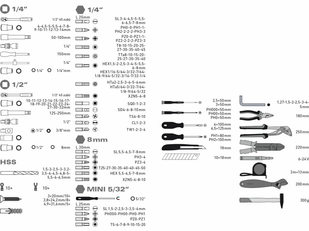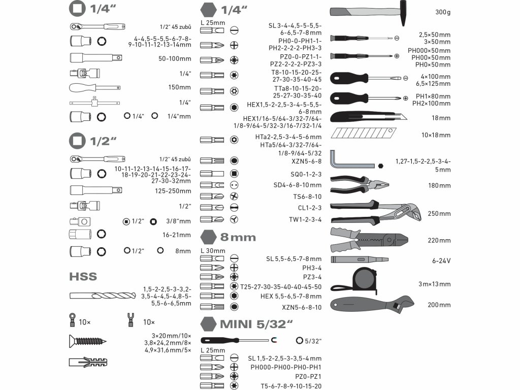 | skrutkovač: | (-)4x100mm,(-)6,5x125mm,PH1x80mm,PH2x100mm, |