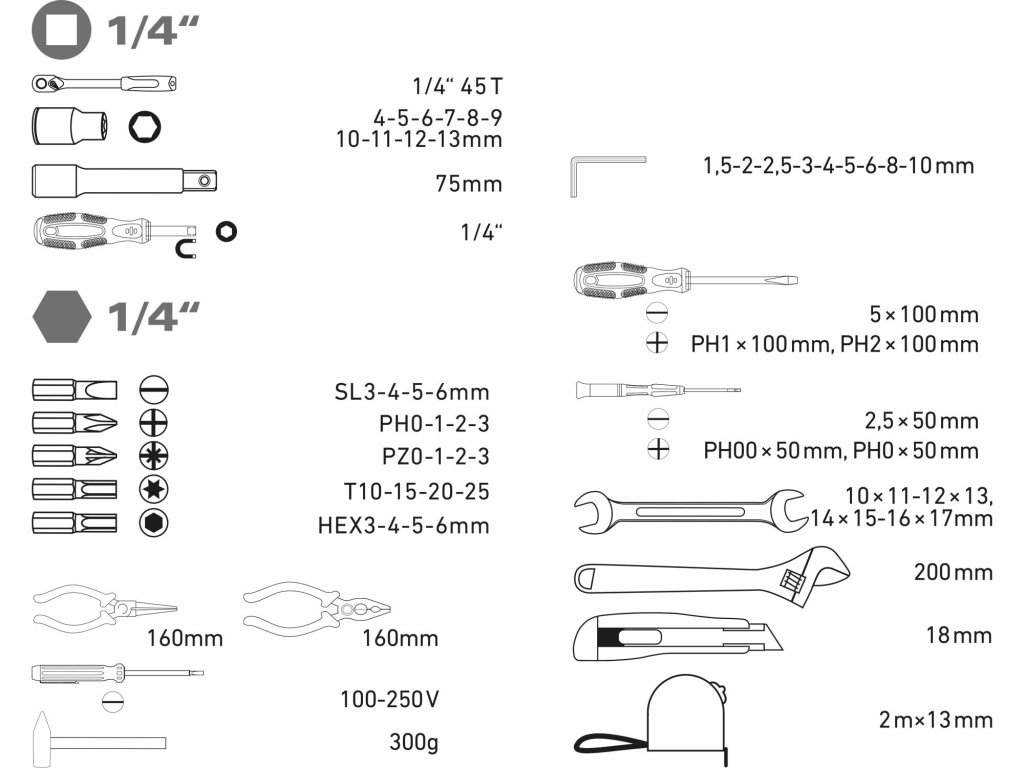 | skrutkovač: | PH1x100mm,PH2x100mm,(-)5x100mm (CrV),magnetický šroubovák na hroty 1/4"x100mm hodinářské šr. PH 00x50mm,PH 0x50mm,SL 2,5x50mm,zk |