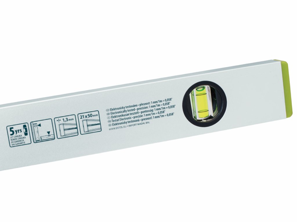 Presnosť 1mm/1m=0,058°, elektronicky testované, hrúbka profilu 1,7mm, libely z akrylového skla- robustnejší profil a silná stena z ľahkej hliníkovej zliatiny zvyšuje odolnosť voči nárazom
