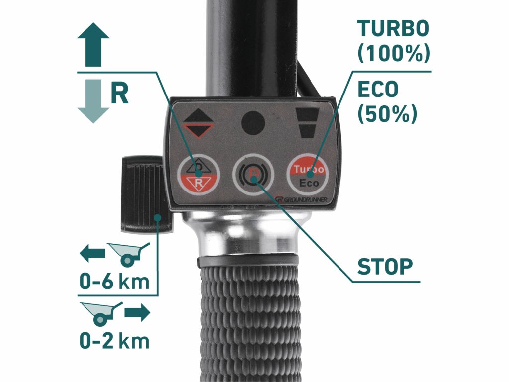 Prepínanie medzi normálnou a Turbo rýchlosťou – režim Turbo je ideálny pri jazde do kopca, v náročnom teréne alebo pri prevoze ťažších nákladov.
