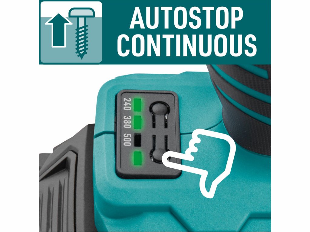 Výkonný bezuhlíkový rázový akumulátorový uťahovač s maximálnym krútiacim momentom 500Nm poskytuje silu potrebnú na široké spektrum prác pri uťahovaní aj povoľovaní skrutiek a matíc. Moderný bezuhlíkový motor má vyššiu životnosť, vyšší výkon a nižšiu spotrebu energie než klasické uhlíkové motory. Uťahovací moment je možné elektronicky nastaviť na tri úrovne: 240/380/500Nm, pričom pri povoľovaní pracuje stroj na najvyššie otáčky. K dispozícii je aj funkcia AUTO STOP, ktorá pri uvoľňovaní uťahovač po krátkej chvíli automaticky vypne, keď je skrutka úplne povolená a nástroj sa voľne otáča. Rázový mechanizmus umožňuje efektívnejšie uvoľňovanie aj silne skorodovaných spojov ako akumulátorová vŕtačka a zároveň šetrí vaše zápästie aj batériu. Celokovová prevodovka uložená v kovovom kryte zabezpečuje spoľahlivý chod aj pri vysokom zaťažení a lepšie odvádza teplo. Pracovné LED svietidlo so oneskoreným vypnutím zlepšuje viditeľnosť a pogumované plochy chránia nástroj pred nárazmi a zvyšujú komfort pri práci vďaka zníženiu vibrácií.