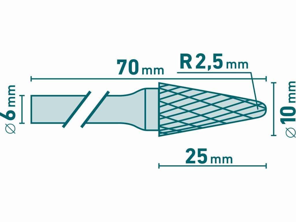 EXTOL INDUSTRIAL 8703784 Fréza karbidová kónická, pologuľaté čelo, Ø10mm, rezná dĺžka 25mm, stopka Ø6mm