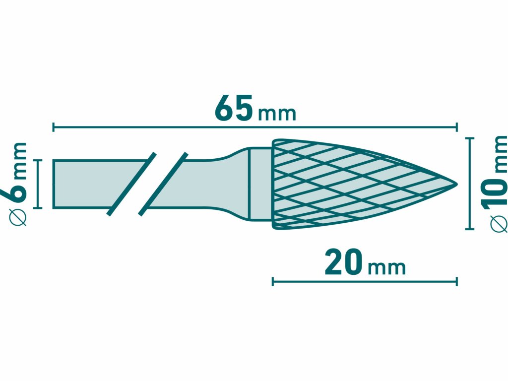 | doplňujúci parameter: | najširší priemer 10mm,rezná dĺžka 20mm,stopka 6mm,celková dĺžka 65mm,pracovné otáčky 20000-23000ot./min. |