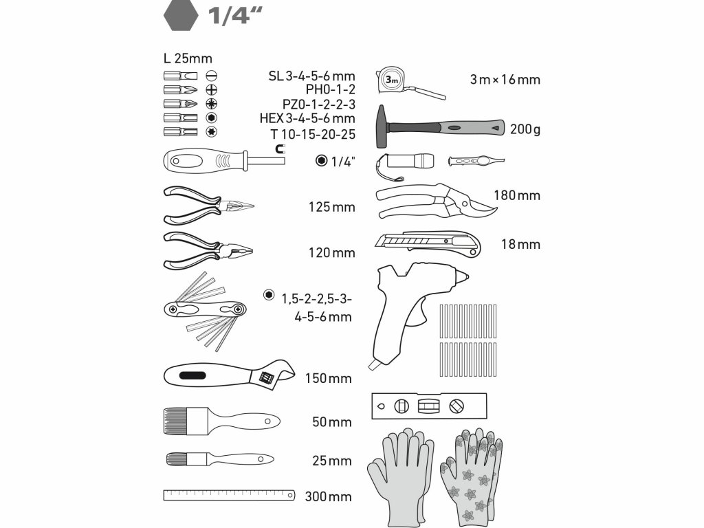 Univerzálna sada navrhnutá pre dievčatá, ženy a dámy, s ktorou vás nič nezaskočí. Kedykoľvek budete potrebovať niečo premerať, zaskrutkovať, povoliť či utiahnuť, odrezať, vyvážiť, zatĺcť či natrieť, zalepiť, na niečo si posvietiť, alebo si trebárs ustrihnúť ružu v záhrade, táto sada v elegantnom mäkkom kufríku vám bude vždy po ruke - a vy budete úplne nezávislá!Dodatočné parametre
