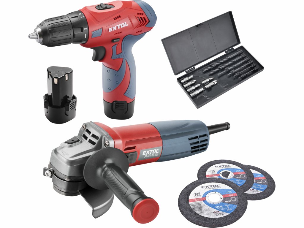 Akčná sada obsahujúca najpopulárnejšie elektrické náradie – aku vŕtačku a uhlovú brúsku. Ľahká výkonná dvojrýchlostná aku vŕtačka v ultra kompaktnej veľkosti je ideálna pre stredne ťažké vŕtanie a skrutkovanie do kovu a dreva. Malá, praktická brúska určená na ľahké rezacie a brúsne práce, obrusovanie zvarovacích švov a pod. Kompaktné rozmery umožňujú pohodlnú prácu jednou rukou. Celá sada je uložená v kvalitnom boxe, ktorý je kompatibilný s boxami Extol Premium. Súčasťou sady je taktiež puzdro s vrtákmi a bitmi a rezné kotúče.