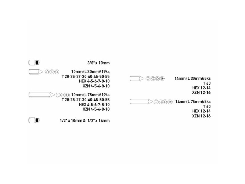 | hlavice zástrčné predĺžené: | bity zástrčné predĺžené 10mm(L75mm):T20-25-27-30-40-45-50-55,H4-5-6-7-8-10mm,XZN4-5-6-8-10, 14mm(L75mm): T60,H12-14mm,XZN12,XZNTa16 |