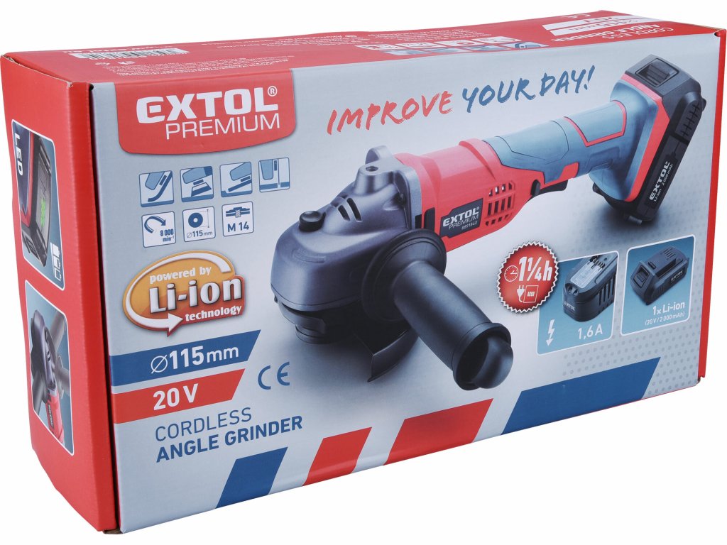 Ľahká a výkonná aku uhlová brúska určená pre menšie brúsiace a rezacie práce. Jej telo je ergonomicky tvarované, aby sa ľahko držala pri práci a pogumovaná rukoväť tlmí vibrácie. Brúska má bezpečnostnú poistku proti náhodnému spusteniu. Elektronicky regulovaný štart (Soft Start) zaisťuje pozvoľný rozbeh náradia, čím šetrí nielen Vaše kĺby, ale aj ozubené kolesá v brúske. Pre bežnú prácu postačia jeden alebo dva 2000mAh akumulátory, ktoré môžete rýchlo nabiť v rýchlonabíjačke. Pri náročnejšej alebo dlhšej práci odporúčame väčšie akumulátory s kapacitou 4000mAh. Akumulátor možno použiť vo všetkých 20V aku strojoch z radu Extol Premium 88918xx. Vďaka Li-ion technológii je možné akumulátory kedykoľvek dobíjať, bez toho aby sa tým znižovala ich kapacita. Li-ion akumulátor stráca energiu vplyvom samovybíjania veľmi pomaly a vydrží dlho nabitý.