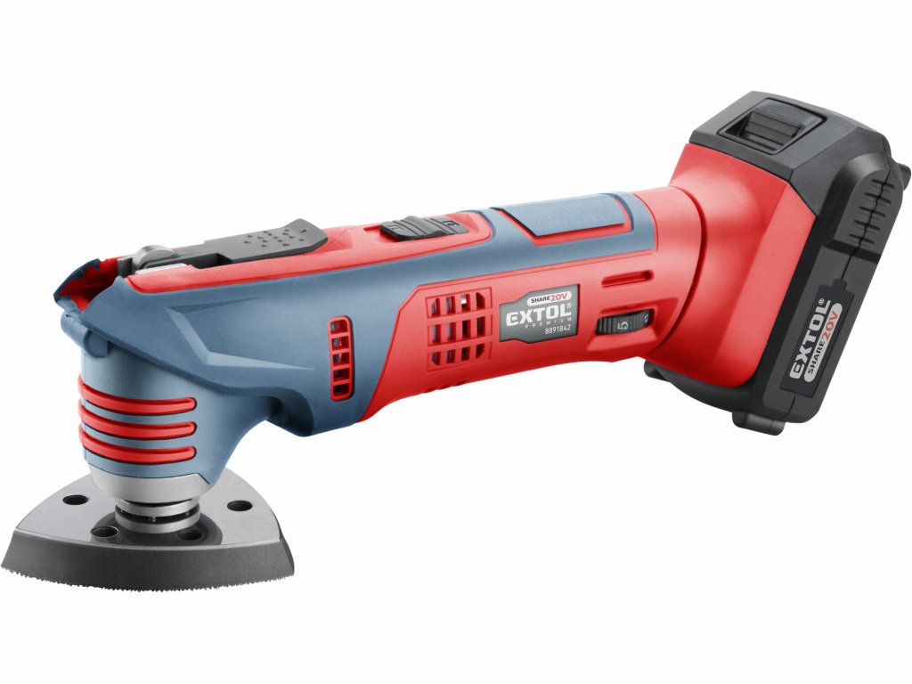 Multifunkčný nástroj určený na pílenie a zarezávanie do drevených materiálov, umelej hmoty, sadrokartónu, mäkkých kovov (meď, hliník, nekalené klince), ďalej na rašpľovanie, brúsenie a zoškrabovanie menších plôch. Nástroj umožňuje vykonávať presné práce na ťažko prístupných miestach, v rohoch nábytku, obkladačiek a pod. Pre bežnú prácu postačia jeden alebo dva 2000mAh akumulátory, ktoré môžete rýchlo nabiť v rýchlonabíjačke. Pri náročnejšej alebo dlhšej práci odporúčame väčšie akumulátory s kapacitou 4000mAh. Akumulátor možno použiť vo všetkých 20V aku strojoch z radu Extol Premium 88918xx. Vďaka Li-ion technológii je možné akumulátory kedykoľvek dobíjať, bez toho aby sa tým znižovala ich kapacita. Li-ion akumulátor stráca energiu vplyvom samovybíjania veľmi pomaly a vydrží dlho nabitý.- regulátor otáčok umožňuje nastavenie otáčok podľa druhu rezaného materiálu
