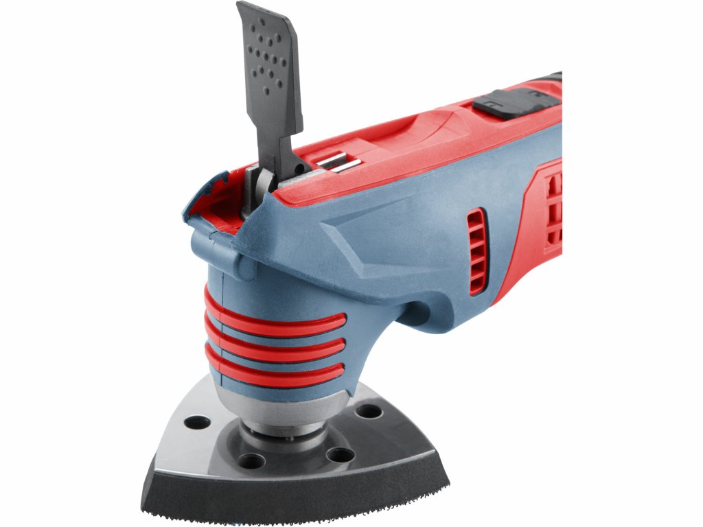 Multifunkčný nástroj určený na pílenie a zarezávanie do drevených materiálov, umelej hmoty, sadrokartónu, mäkkých kovov (meď, hliník, nekalené klince), ďalej na rašpľovanie, brúsenie a zoškrabovanie menších plôch. Nástroj umožňuje vykonávať presné práce na ťažko prístupných miestach, v rohoch nábytku, obkladačiek a pod. Pre bežnú prácu postačia jeden alebo dva 2000mAh akumulátory, ktoré môžete rýchlo nabiť v rýchlonabíjačke. Pri náročnejšej alebo dlhšej práci odporúčame väčšie akumulátory s kapacitou 4000mAh. Stroj je bez akumulátora a nabíjačky.- regulátor otáčok umožňuje nastavenie otáčok podľa druhu rezaného materiálu
