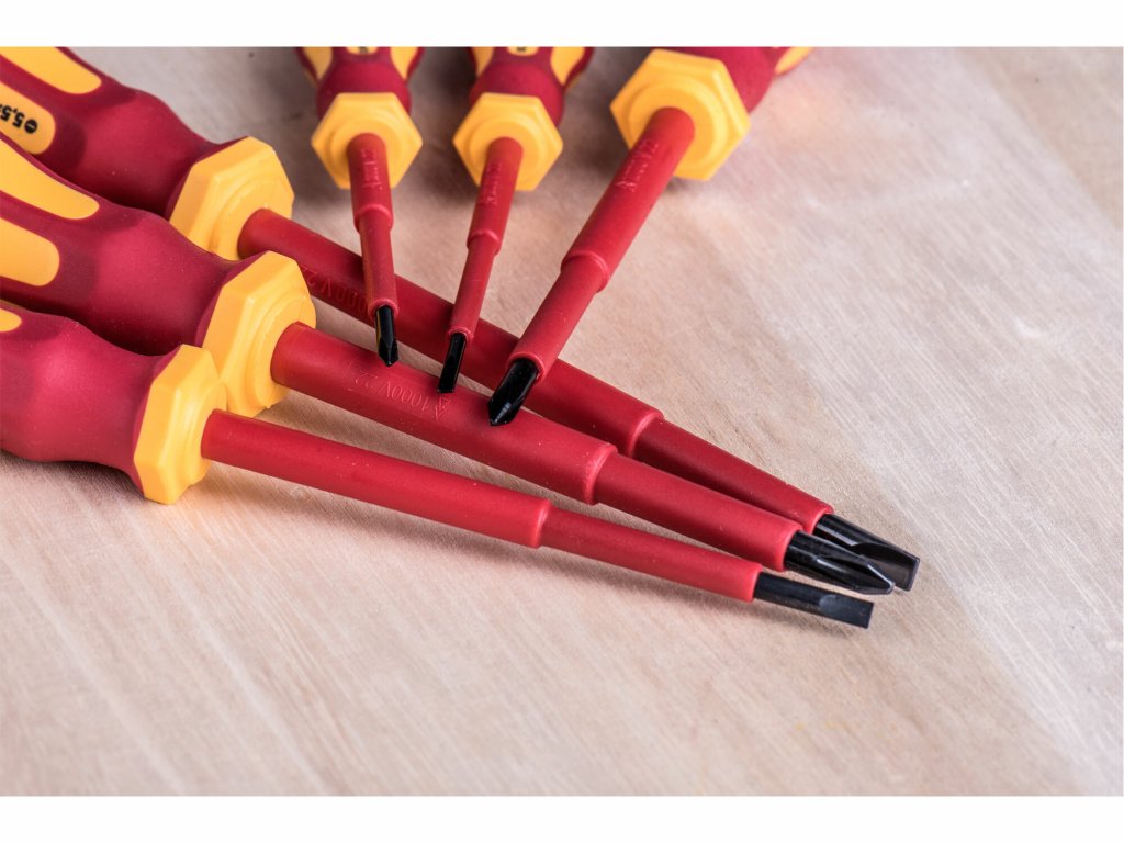Spĺňa normy IEC60900, JF-258, F-5001503- ergonomicky tvarovaná rukoväť z tvrdého PP plastu, na povrchu mäkčená protisklzovou TPR gumou, pre zvýšenie krútiacej sily skrutkovača