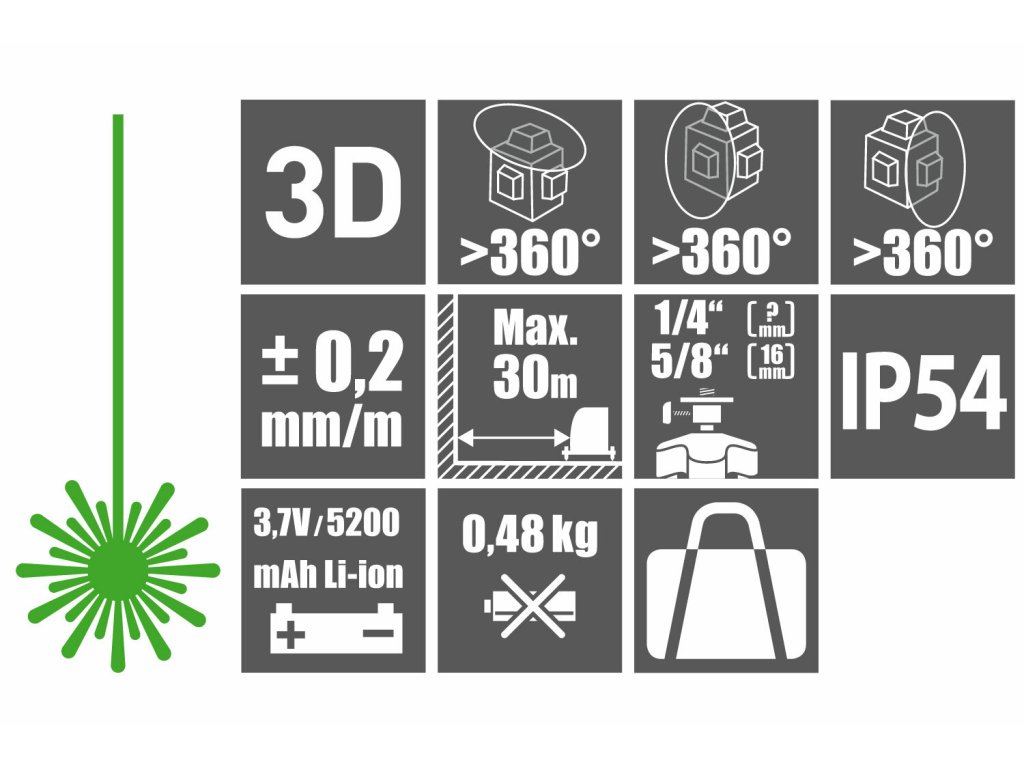 - 3D model umožňuje zobraziť línie všetkých základných rovín súčasne, prípadne zapínať jednu po druhej, výkonný a dobre viditeľný zelený laserový lúč zaručuje dobrú odčítateľnosť aj vo vonkajších priestoroch