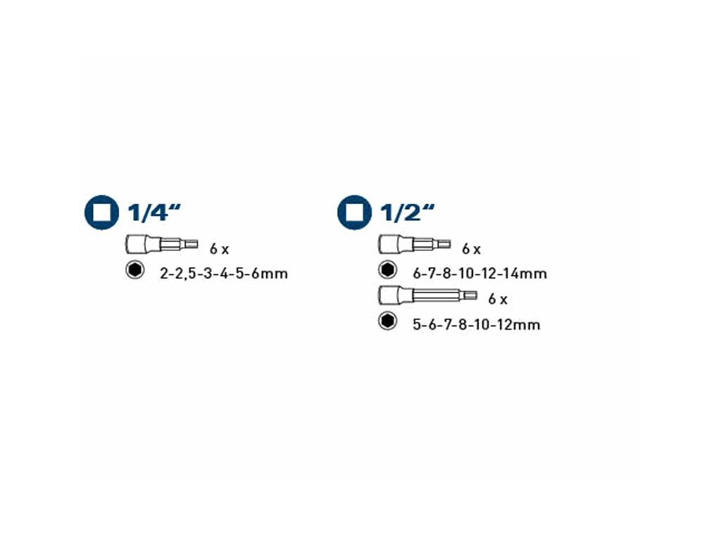 | hlavice zástrčné: | 1/4": HEX2-2,5-3-4-5-6mm,1/2": 6-7-8-10-12-14mm |