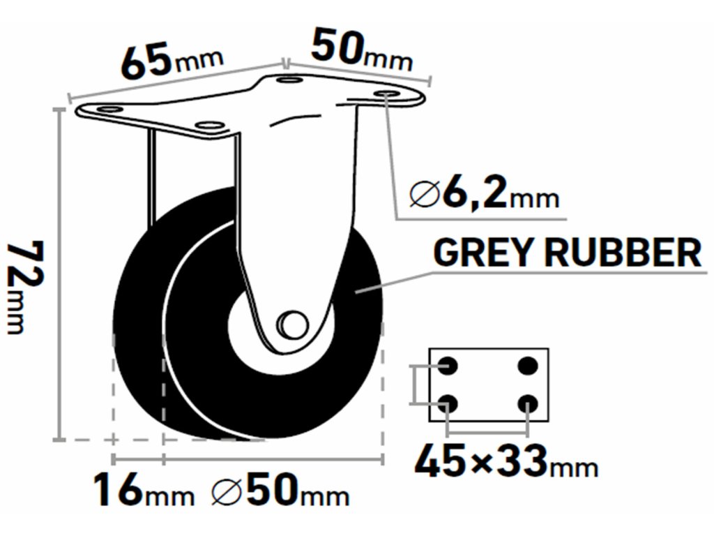 | doplňujúci parameter: | Ø50mm, šírka 16mm, nosnosť max. 27kg/1ks, výška vrátane základne 72mm, rozmer základne 65x50mm, rozstup dier 45x33mm (Ø6,2mm), oska v kovovom puzdre, gumené, šedé |