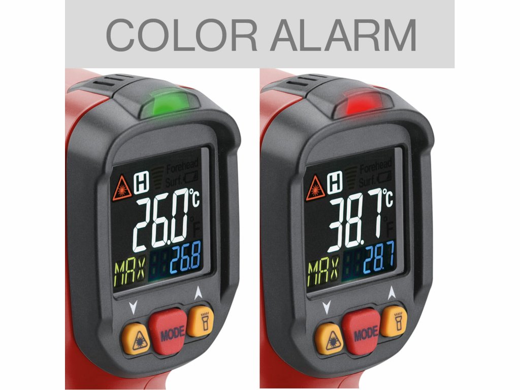 - svetelná farebná indikácia pri kontrolnom meraní ľubovoľne nastavenej teploty. Možno nastaviť indikáciu pokiaľ je teplota pod alebo nad zvolenou hodnotou.