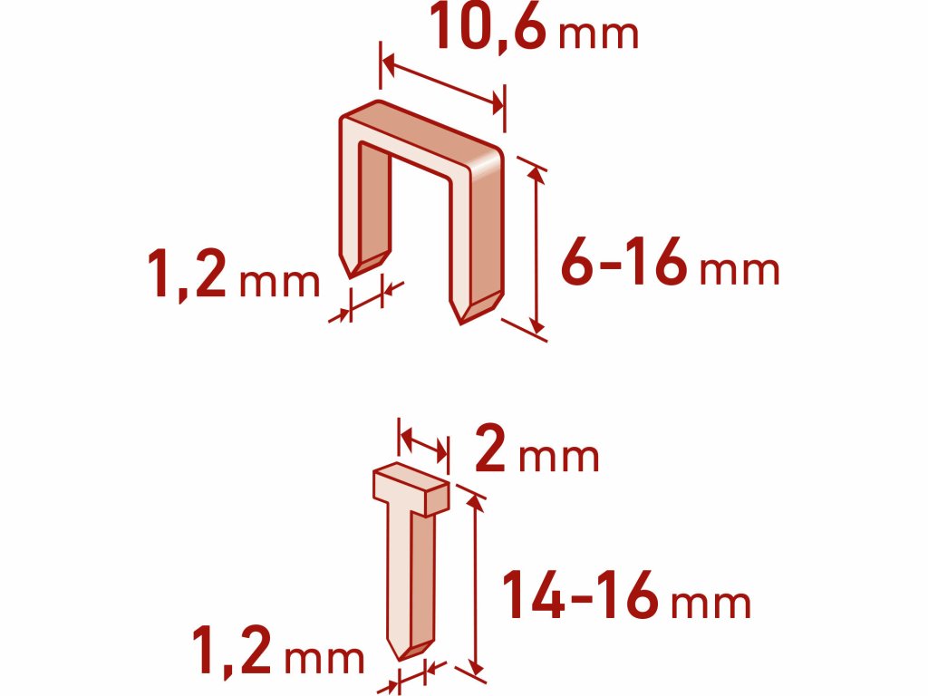 | doplňujúci parameter: | dĺžka spony 6-16mm,šírka spony 10,6x1,2mm,klinec 14-16x1,2mm |