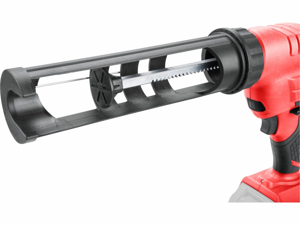 Akumulátorová výtlačná pištoľ je určená na vytláčanie kartušových tmelov, silikónu, chemických kotiev a pod. Rýchlosť posuvu piestu je možné nastaviť v rozsahu 50-560mm/min. Klietku na kartušu je možné otáčať o 360°. Pištoľ je vybavená funkciou ANTI-DRIP, ktorá po uvoľnení spúšte posunie piest mierne späť, čím zabráni samovoľnému vytláčaniu tmelu. Priamo nad batériou je umiestnené LED osvetlenie, ktoré osvetľuje pracovné miesto. Stroj je vybavený ochrannou proti preťaženiu.