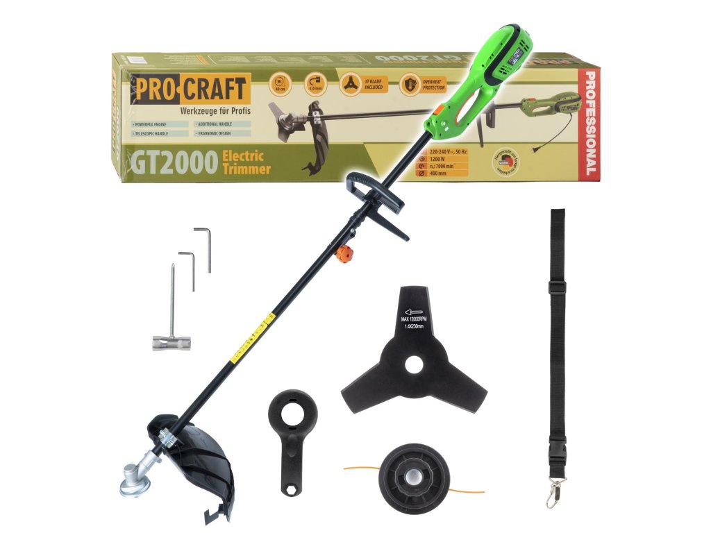 Elektrický krovinorez Procraft GT2000 je určený na kosenie trávnatých plôch. Výkonný 1200W motor s výkonom 7000/min zaručuje kvalitné kosenie menších plôch, brehov a okrajov záhrad. Ovládanie predĺženia struny je poloautomatické. Súčasťou dodávky je strunová hlava, kovový žací nôž, popruh a montážny kľúč. Kartónové balenie.