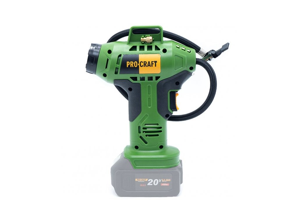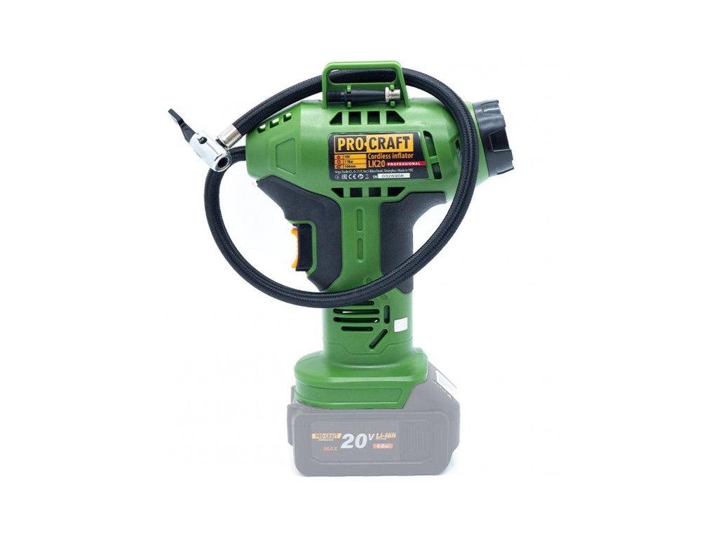 Akumulátorový kompresor Procraft LK20 (bez batérie a nabíjačky) Displej, voľba tlaku, automatické vypnutie Batéria: 20V, 2Ah Max. plniaci tlak: 160 psi, 11 atm, 1100 kPa Otáčky: 0-3200/min Prietok: 12 l/min Dĺžka vzduchovej hadice: 0,5 m