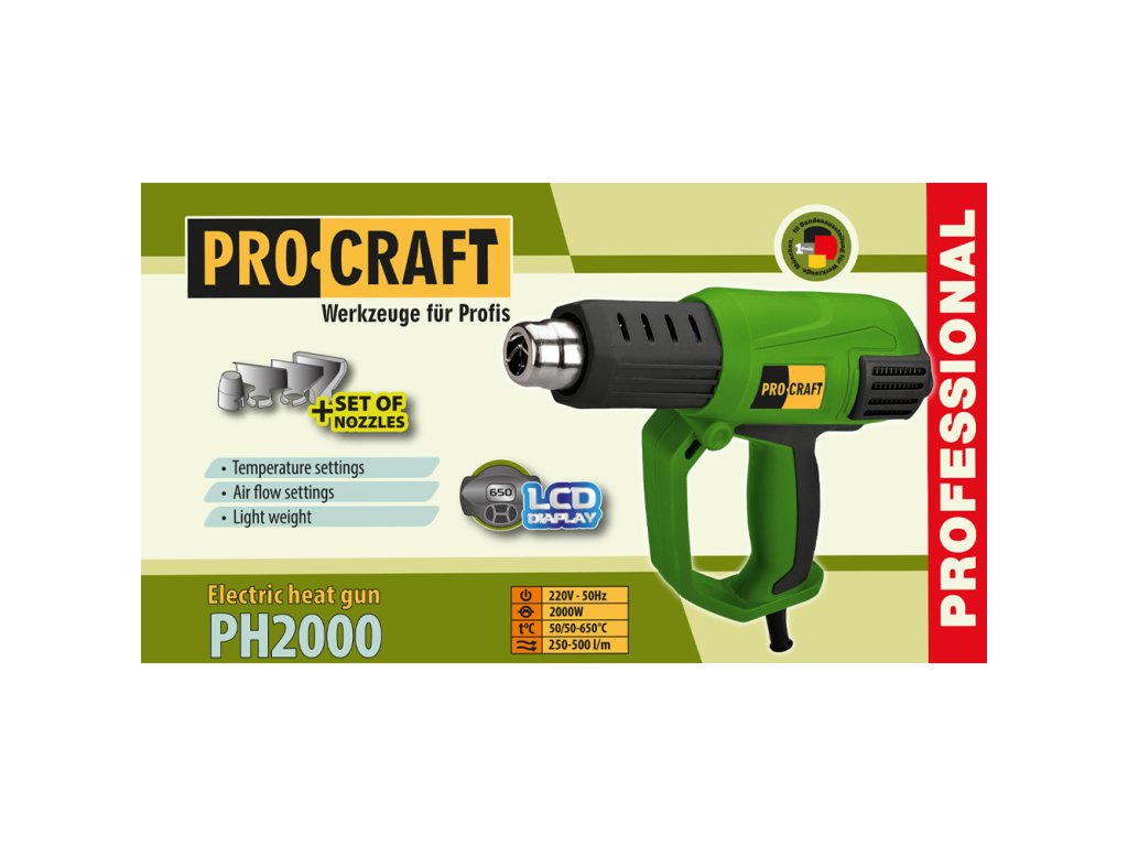 Horúcovzdušná pištoľ Procraft PH2000 je určená na odstraňovanie farby, laku, fólie, sušenie nových vrstiev, tvarovanie a ohýbanie plastov. Regulácia teploty v rozsahu 50-600 °C a prietoku vzduchu