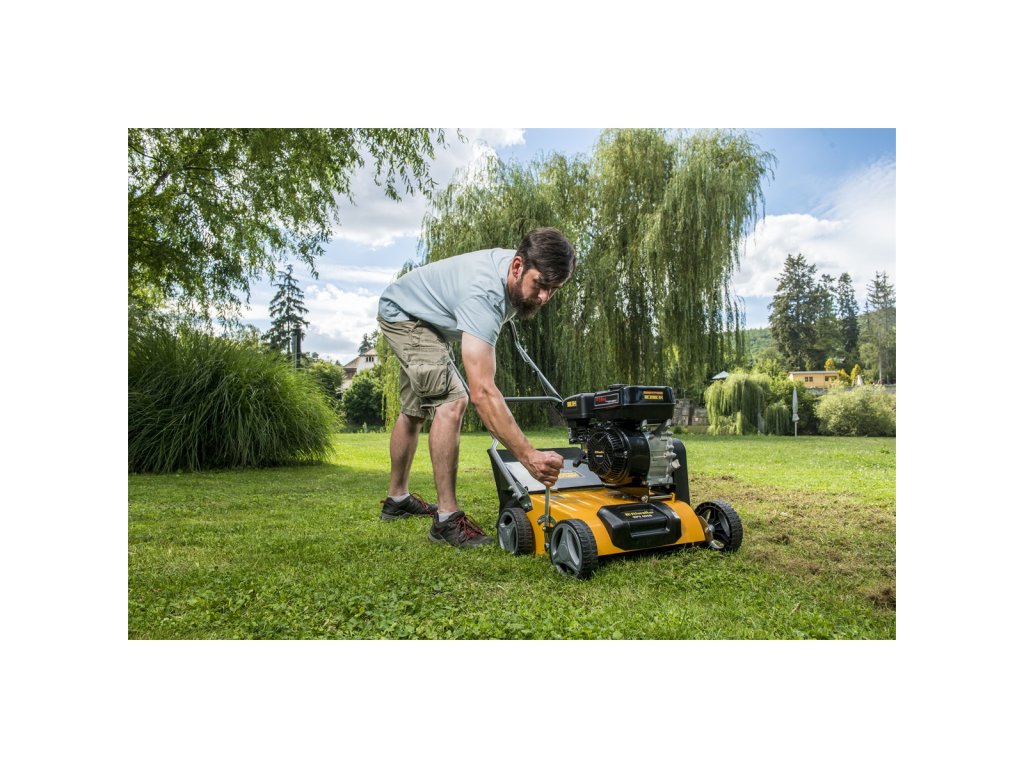 • riadidlá majú ergonomický tvar, nastavenie hĺbky vertikutácie sa deje ľahko pomocou jednej páky a 4 veľké kolesá umožní hladký pohyb aj po nerovnom teréne
