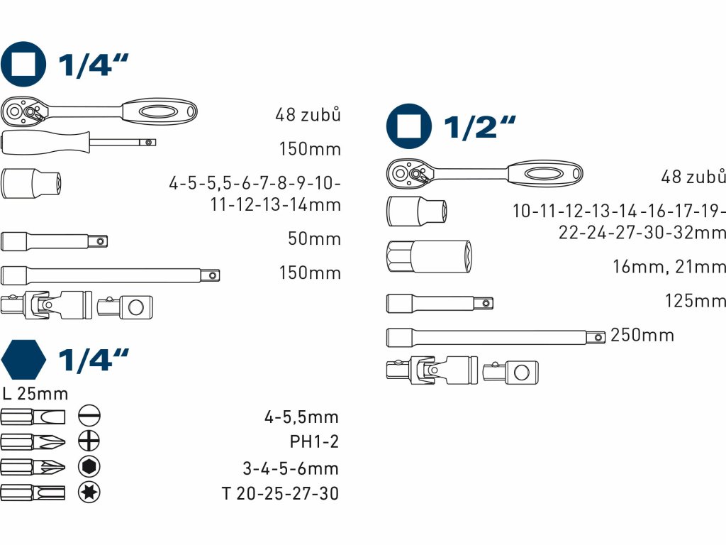 | hlavice nástrčné: | 1/4": 4-5-5,5-6-7-8-9-10-11-12-13-14mm,1/2": 10-11-12-13-14-16-17-19-22-24-27-30-32mm |