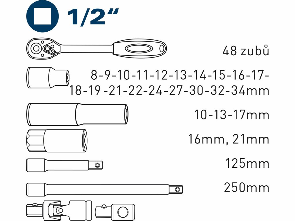 | hlavice nástrčné: | 1/2": 8-9-10-11-12-13-14-15-16-17-18-19-21-22-24-27-30-32-34mm |