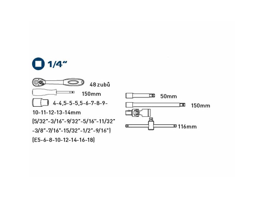 | hlavice nástrčné: | 1/4": 4-5-5,5-6-7-8-9-10-11-12-13-14mm (5/32"-3/16"-9/32"-5/16"-11/32"-3/8"-7/16"-15/32"-1/2"-9/16") (E5-6-8-10-12-14-16-18) |