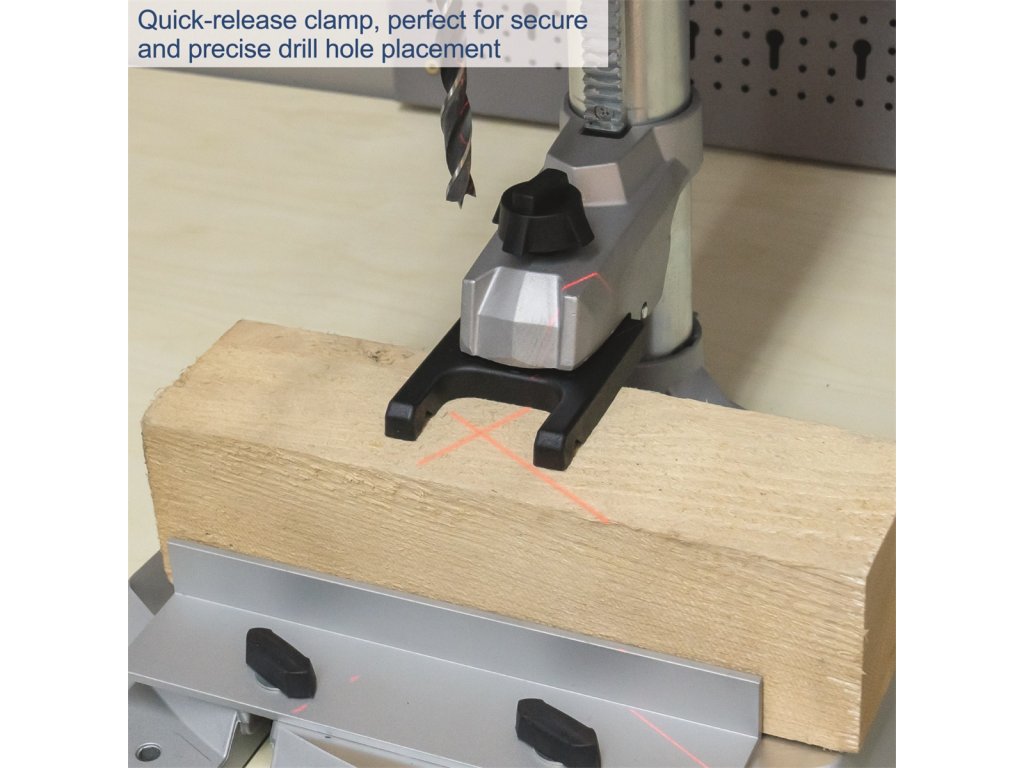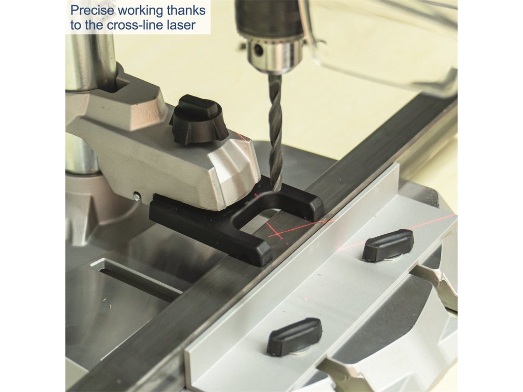 Scheppach DP 55 představuje moderní a uživatelsky přívětivé pojetí stojanové vrtačky vhodné do každé domácí dílny. Stroj je velmi přesný a intuitivně se ovládá. Díky silnému motoru a plynulému elektronickému nastavení rychlosti otáček, si vždy zvolíte ideální parametry vrtání, které se zobrazují na digitálním displeji. Spolu s nastavitelnou hloubkovou zarážkou tak můžete vrtat libovolný počet stejně hlubokých děr. Přesnost práce vám zvýší i přesný křížový laser, velké otočné madlo s měkčenou protiskluzovou úpravou a kvalitní sklíčidlo. Pracovní stůl je jednak vybaven rychloupínací svorkou, která umožňuje sevřít obrobky různých tvarů a dále drážkami, do kterých lze upnout příslušenství, jako například standardně dodávané paralelní vodítko. Stroj samozřejmě splňuje poslední požadavky evropské unie na bezpečnost, jako je např. hlavní vypínač umístěný na čele stroje, průhledný kryt sklíčidla ap. Stroj je umístěn na stabilním podstavci s možností pevného uchycení šrouby k pracovní desce.