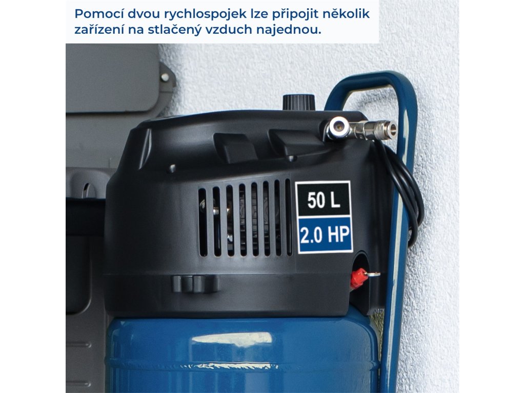 • Jeho vzdušník s objemom 50 litrov a tlak 10 barov sú zárukou toho, že všetky operácie spájané s fúkaním, striekaním, ofukovaním, sponkovaním a takisto práce spojené s pneumatickým náradím, budú prebiehať hladko a s dostatočnou výkonovou rezervou