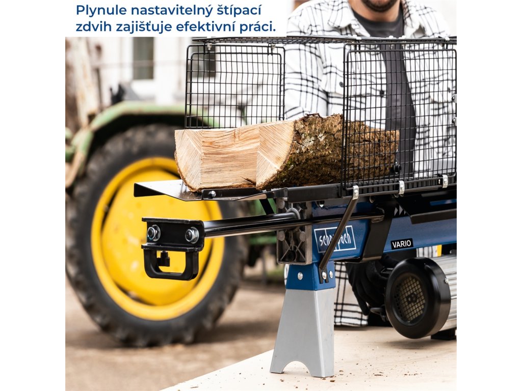 • Štiepačka je vybavený systémom VARIO, čo v praxi znamená, že si môžete nastaviť dráhu piestu podľa dĺžky polena a nemusíte tak zakaždým čakať, až sa piest vráti do najzadnejšej polohy. Dajú sa tak ušetriť až desiatky percent času a nemalá časť elektrickej energie.