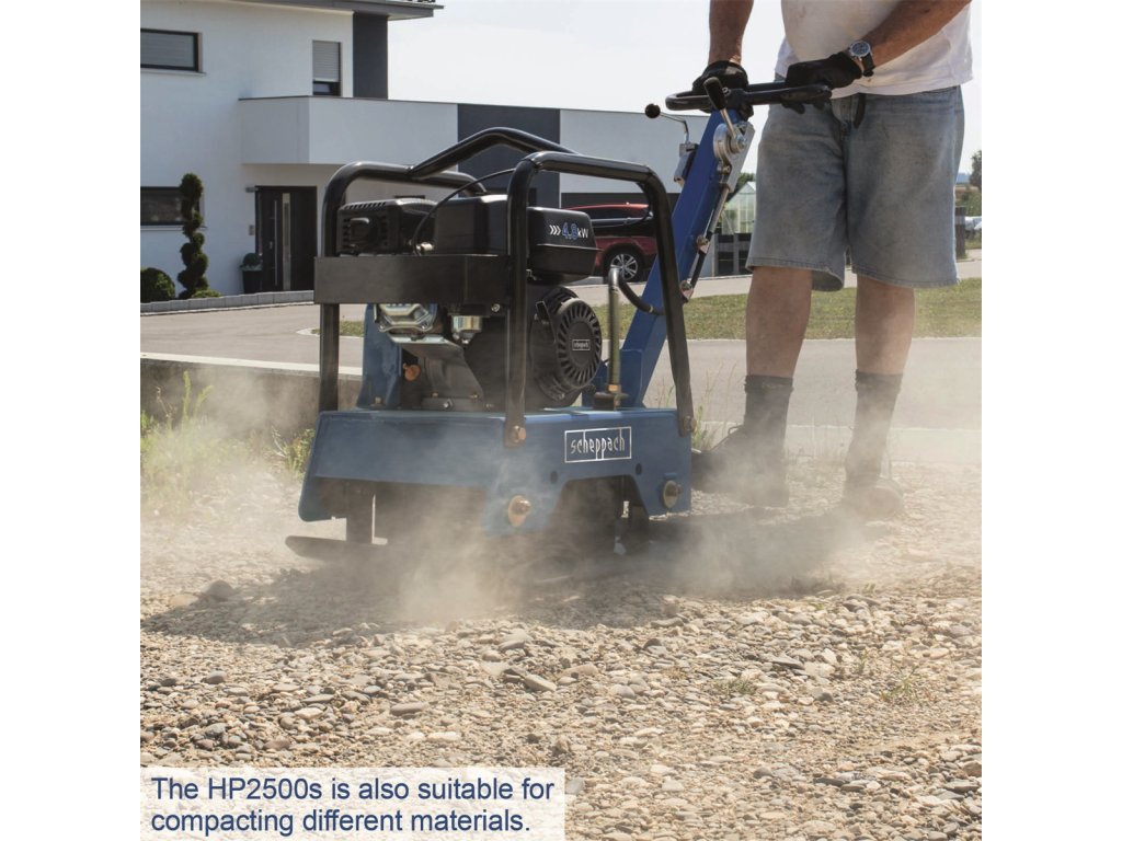 Obojsmerná vibračná doska Scheppach HP 2500 S je výkonný univerzálny hutniaci stroj kategórie 125 kg, vhodný pre hutnenie zemín, živičných vrstiev, zámkovej dlažby, sypaného kameňa, utláčaním zeminy v záhradách, opravy ciest, pokládku chodníkov a ďalšie terénne a výkopové práce.