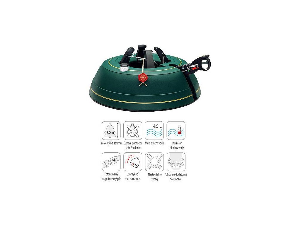 - chytré upínacie zariadenie zabezpecuje, že vianocný stromcek stojí absolútne pevný a rovno bez ohladu na to ci je hrubý, tenký alebo krivý. Stací stlacit pedál a zaistit stromcek.