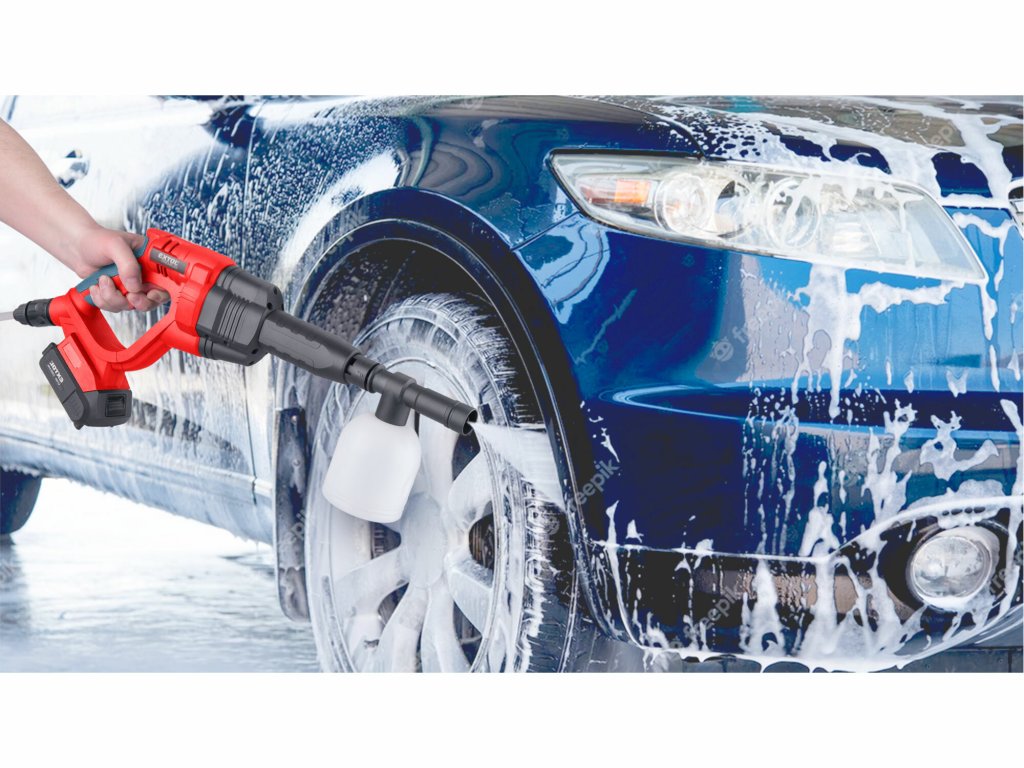 Akumulátorový tlakový čistič je určený na tlakové čistenie vodou s max. tlakom 22bar. Vďaka napájaniu z batérie a funkcii samonasávania vody ho môžete použiť prakticky kdekoľvek a ľahko umyť napr. bicykel, auto, chodník či terasu, záhradný nábytok, umývateľnú fasádu, alebo po prestavení dýzy zalievať kvety. Čistič je možné pripojiť rýchlospojkou na klasickú záhradnú hadicu pripojenú na vodovodný rozvod alebo použiť priloženú hadicu so sacím košom a použiť voľne prístupnú zásobu vody z vedra, rieky, jazera, suda s dažďovou vodou a pod. Pri napájaní z vodovodného rozvodu je možné aku čistič použiť aj bez batérie, avšak výstupný tlak vody z dýzy bude výrazne nižší. S priloženým adaptérom je možné v núdzi použiť aj vodu z bežnej PET fľaše. Vďaka nízkej spotrebe vody je možné čistič veľmi dobre používať aj s menším objemom vody. Stroj je vybavený multifunkčnou dýzou so 6 nastaviteľnými typmi lúčov: priamy prúd, vejár 15˚, 25˚ a 40˚, bočný lúč pod uhlom 45˚ na umývanie napríklad strechy alebo podvozku auta a režim sprchy, ktorý sa dá použiť aj na zalievanie kvetov. Pre zvýšenie účinnosti čistenia je možné k čističu pripojiť šampónovací adaptér s nádobkou na čistiaci prostriedok určený pre tlakové vodné čističe s nízkotlakovým šampónovaním. Pripojenie hadice v zadnej časti čističa zlepšuje manipuláciu pri práci. Pre bežnú prácu postačuje jeden alebo dva 2Ah akumulátory, ktoré je možné rýchlo nabiť vo výkonnej nabíjačke, pre náročnejšiu alebo dlhšiu prácu akumulátory s kapacitou až do 8Ah. Akumulátor je možné použiť vo všetkých typoch náradia radu Extol Share20V. Vďaka použitej Li-ion technológii ho je možné kedykoľvek dobíjať bez toho, aby sa tým znižovala jeho kapacita.
