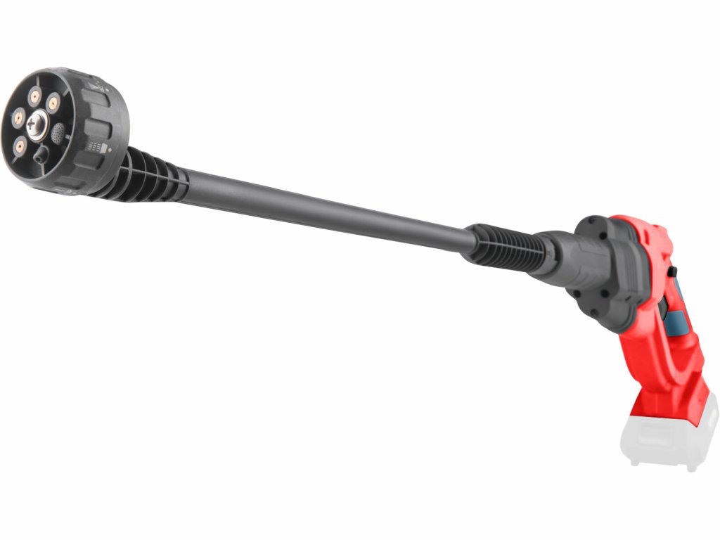Akumulátorový tlakový čistič je určený na tlakové čistenie vodou s max. tlakom 22bar. Vďaka napájaniu z batérie a funkcii samonasávania vody ho môžete použiť prakticky kdekoľvek a ľahko umyť napr. bicykel, auto, chodník či terasu, záhradný nábytok, umývateľnú fasádu, alebo po prestavení dýzy zalievať kvety. Čistič je možné pripojiť rýchlospojkou na klasickú záhradnú hadicu pripojenú na vodovodný rozvod alebo použiť priloženú hadicu so sacím košom a použiť voľne prístupnú zásobu vody z vedra, rieky, jazera, suda s dažďovou vodou a pod. Pri napájaní z vodovodného rozvodu je možné aku čistič použiť aj bez batérie, avšak výstupný tlak vody z dýzy bude výrazne nižší. S priloženým adaptérom je možné v núdzi použiť aj vodu z bežnej PET fľaše. Vďaka nízkej spotrebe vody je možné čistič veľmi dobre používať aj s menším objemom vody. Stroj je vybavený multifunkčnou dýzou so 6 nastaviteľnými typmi lúčov: priamy prúd, vejár 15˚, 25˚ a 40˚, bočný lúč pod uhlom 45˚ na umývanie napríklad strechy alebo podvozku auta a režim sprchy, ktorý sa dá použiť aj na zalievanie kvetov. Pre zvýšenie účinnosti čistenia je možné k čističu pripojiť šampónovací adaptér s nádobkou na čistiaci prostriedok určený pre tlakové vodné čističe s nízkotlakovým šampónovaním. Pripojenie hadice v zadnej časti čističa zlepšuje manipuláciu pri práci.- dýza so 6 nastaviteľnými typmi lúčov
